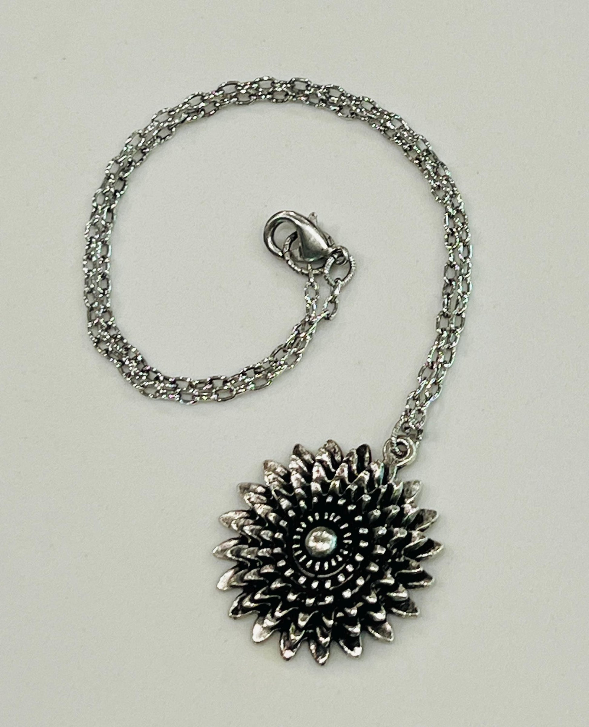Small classic cable chain with non-tarnish silver plated pewter gorgeous large flower pendant. The pendant is 1.25 inches in length. The length can be adjusted from 16 inches to 18 inches. Chain is made out of silver plated brass. Arrives thoughtfully packaged in an eco-friendly kraft box wrapped in ribbon, ready for gifting or keeping for yourself.