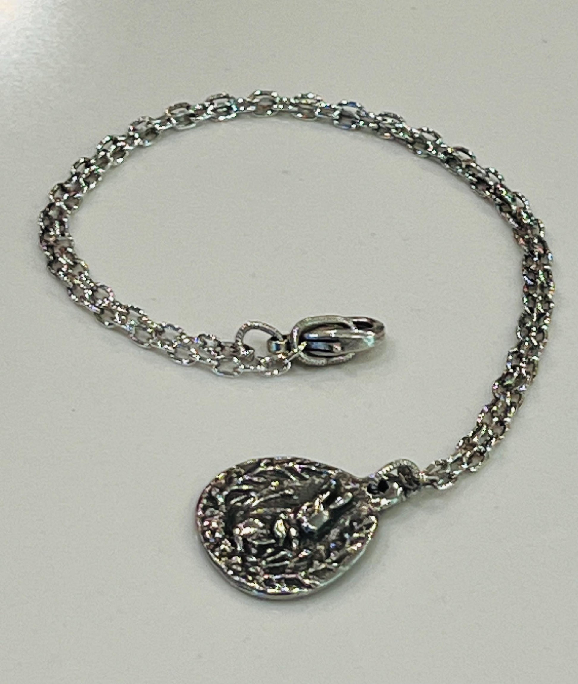 Small classic cable chain with non-tarnish silver plated pewter rabbit pendant by Green Girl Studios. The pendant is 1 inches in diameter. The length can be adjusted from 16 inches to 18 inches. Chain is made out of silver plated brass. Arrives thoughtfully packaged in an eco-friendly kraft box wrapped in ribbon, ready for gifting or keeping for yourself.