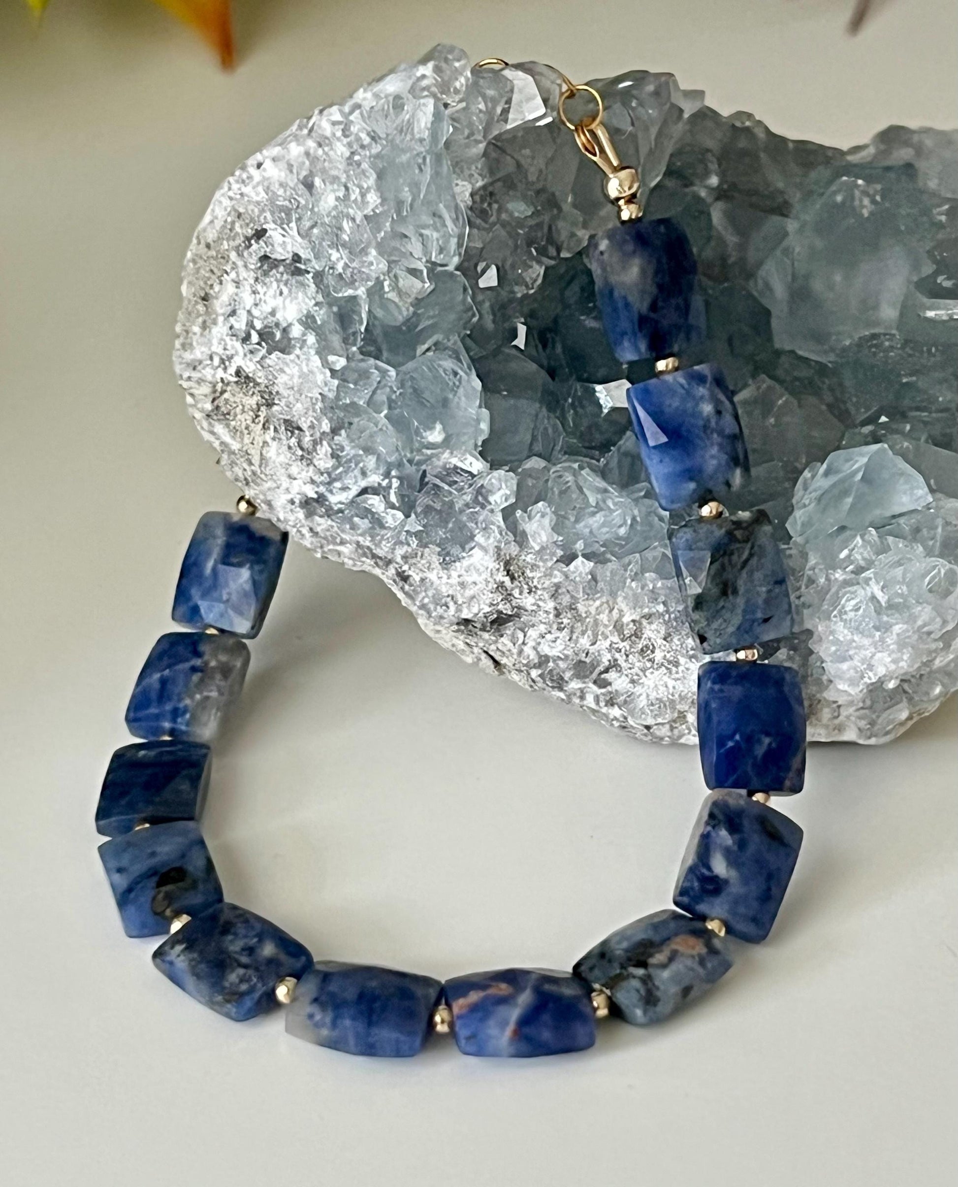 10x8mm Faceted Rectangular Sodalite stones with gold filled beads, gold filled clasp, and gold filled extender that allows for length to range from 6.5 to 8 inches. Arrives thoughtfully packaged in an eco-friendly kraft box wrapped in ribbon, ready for gifting or keeping for yourself.