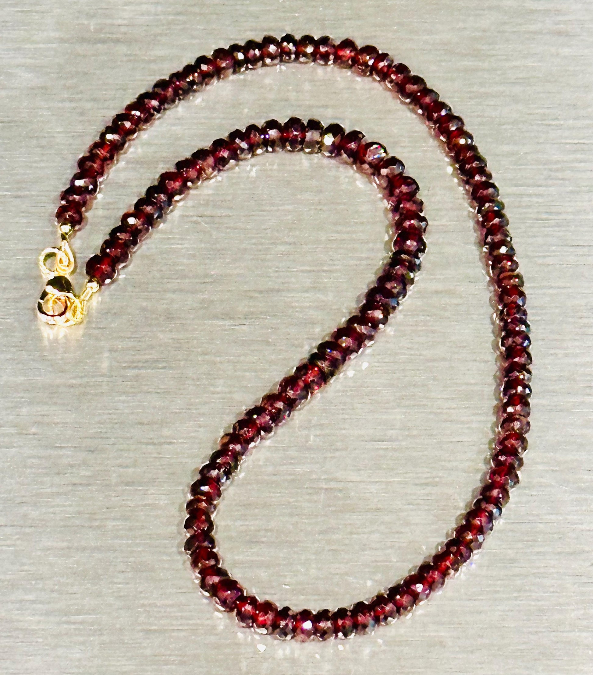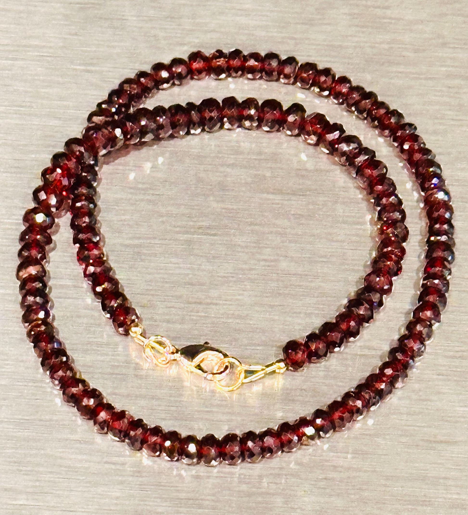 Natural Semi-Precious Gemstone Necklace. Sparkling deep red 5.5mm faceted rondelle necklace with 18k gold filled clasp and accent beads. Perfect simple layering necklace or makes a statement all by itself. Arrives thoughtfully packaged in an eco-friendly kraft box wrapped in ribbon, ready for gifting or keeping for yourself.