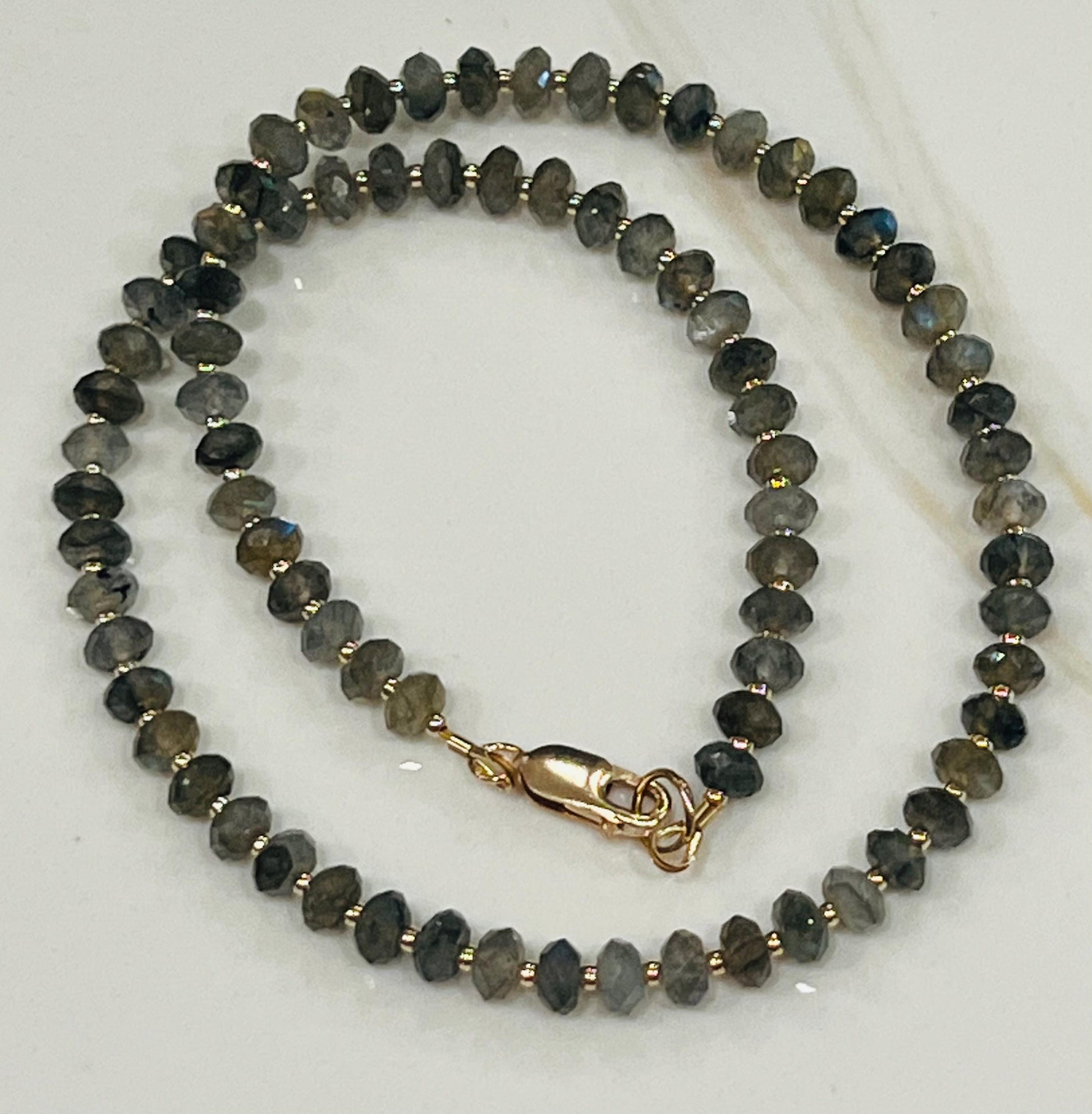 Natural Gemstone Necklace. Labradorite 6x3mm faceted rondelle with an 18k gold filled clasp and 18k gold filled 2mm beads between each labradorite stone. Perfect elegant layering necklace. In the metaphysical world, labradorite is considered one of the most powerful protectors. The gemstone creates a shield for auras and protects against negativity of the world. Labradorite is said to temper the negativity within ourselves as well.Arrives thoughtfully packaged in an eco-friendly kraft box wrapped in ribbon, ready for gifting or keeping for yourself.