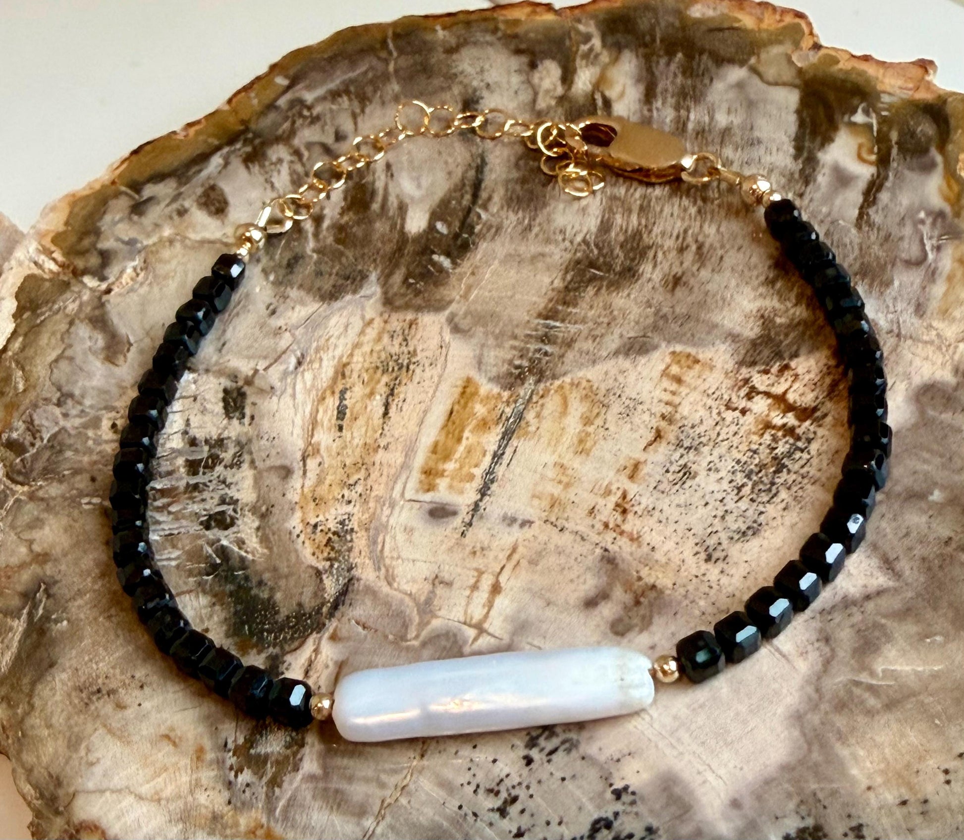 Black Spinel 3mm table cut cubed stones and Freshwater Biwa pearl with gold filled beads, a gold filled clasp, and gold filled extender that allows for length to range from 6.5 to 8 inches. Arrives thoughtfully packaged in an eco-friendly kraft box wrapped in ribbon, ready for gifting or keeping for yourself.