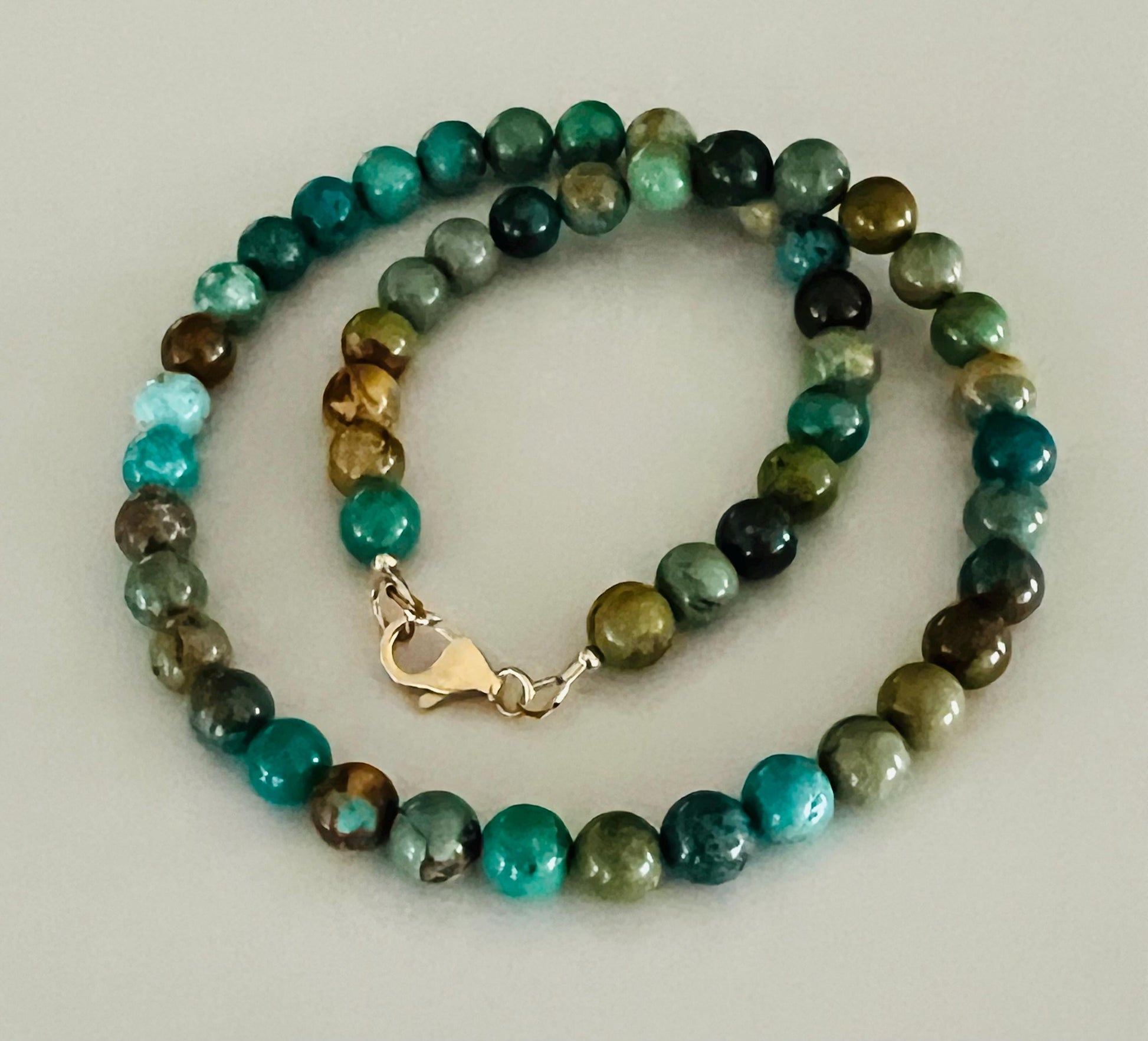 Natural Green Turquoise 7.5mm smooth round beads with an 18k gold filled lobster clasp. Arrives thoughtfully packaged in an eco-friendly kraft box wrapped in ribbon, ready for gifting or keeping for yourself.