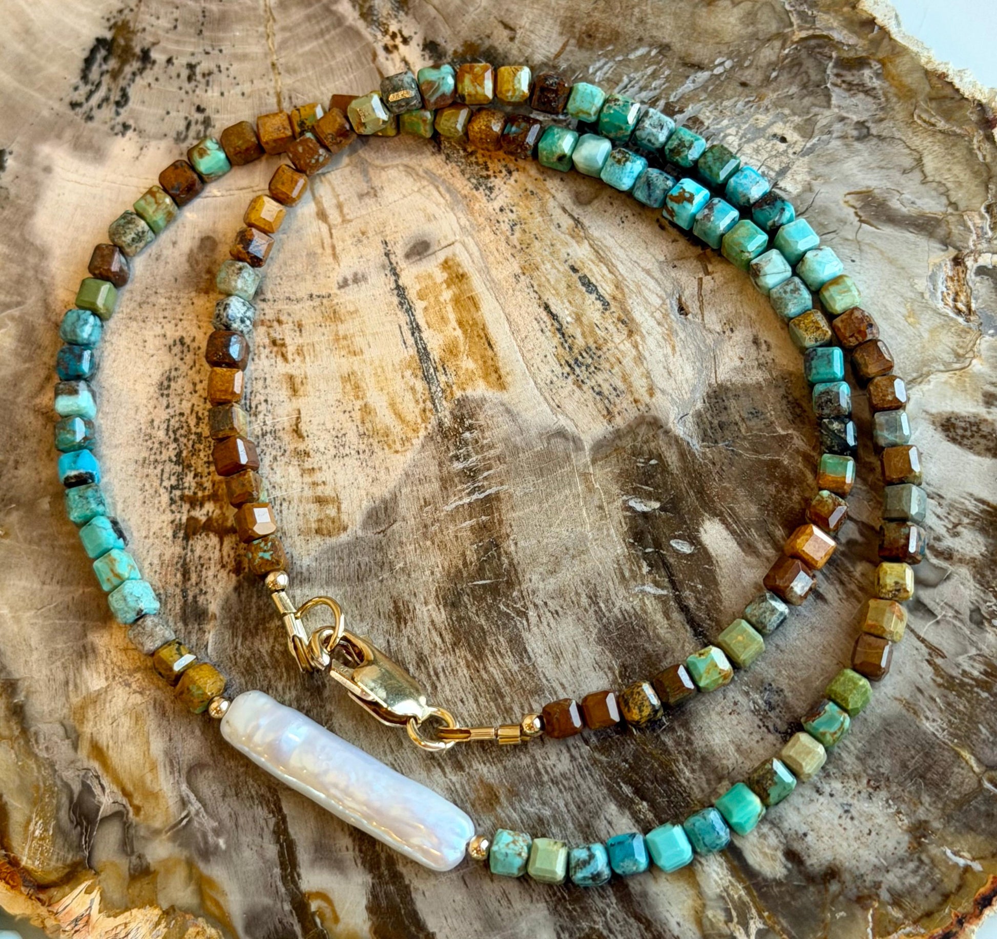 Turquoise Necklace: 18k Gold Filled Clasp, Natural Gemstone 3mm Faceted Table Cut Cubed Hubei Turquoise and Freshwater Biwa Pearl Necklace