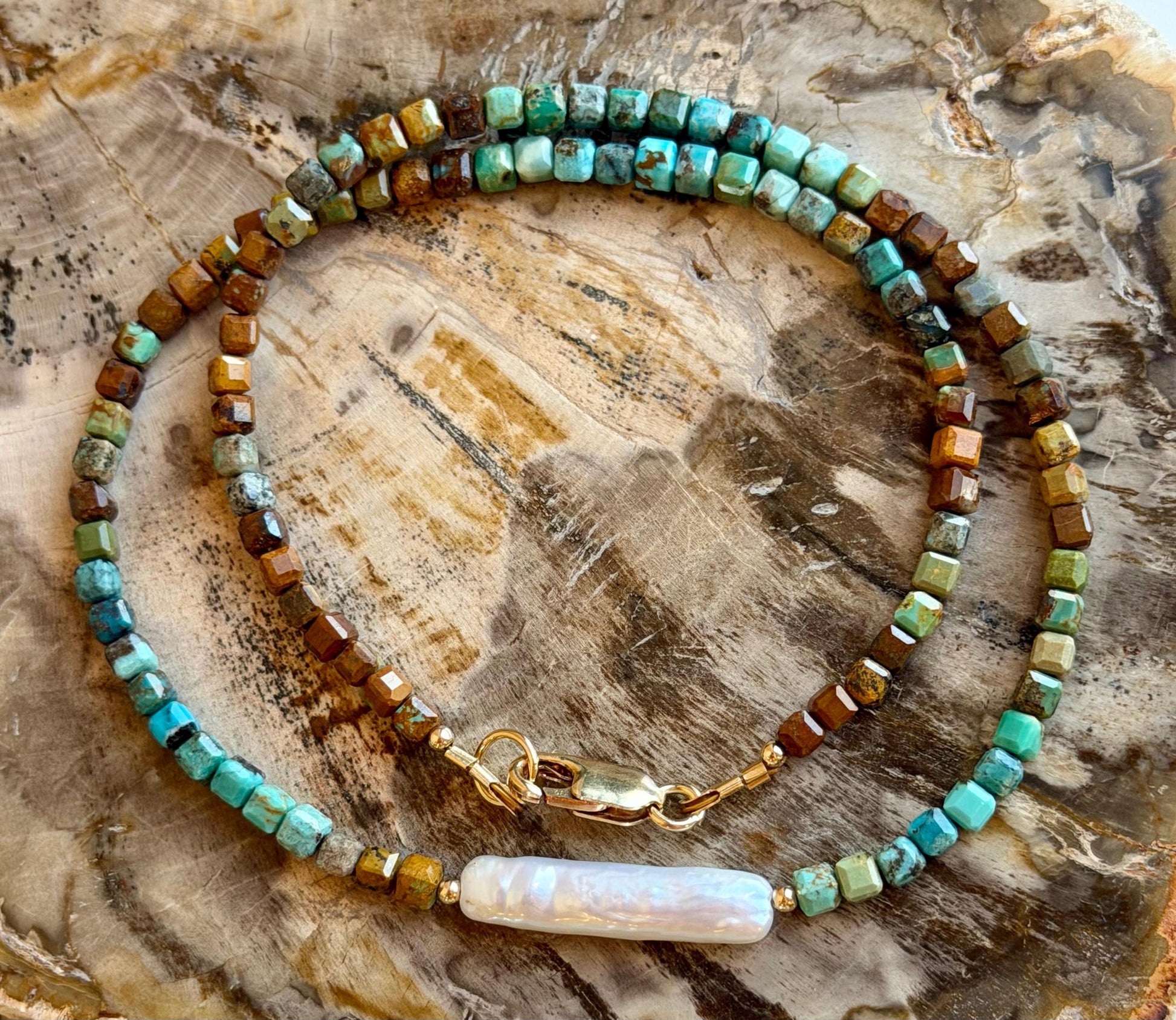 Natural Gemstone Necklace. 4mm faceted table cut cubed Hubei natural turquoise and Biwa Freshwater Pearl beaded necklace with gold filled lobster clasp and gold filled accent beads. Arrives thoughtfully packaged in an eco-friendly kraft box wrapped in ribbon, ready for gifting or keeping for yourself.